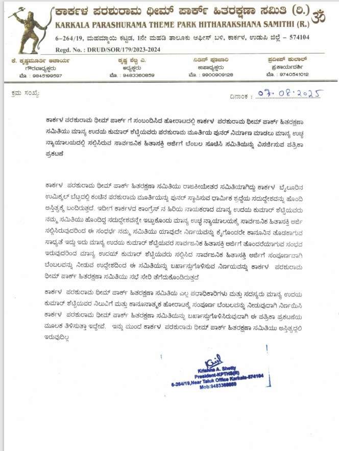 ಕಾರ್ಕಳ ಪರಶುರಾಮ ಥೀಮ್ ಪಾರ್ಕ್ ಹಿತರಕ್ಷಣಾ ಸಮಿತಿಯು ರಾಜಕೀಯೇತರ ಸಮಿತಿಯಾಗಿದ್ದು, ಕಾರ್ಕಳ ಬೈಲೂರಿನ ಉಮಿಕ್ಕಲ್ ಬೆಟ್ಟದಲ್ಲಿ ಕಂಚಿನ ಪರಶುರಾಮ ಮೂರ್ತಿಯನ್ನು ಪುನರ್ ಸ್ಥಾಪಿಸುವ ಧಾರ್ಮಿಕ ಶ್ರದ್ದೆಯ ಸದುದ್ದೇಶವನ್ನು ಹೊಂದಿ ಅಸ್ತಿತ್ವಕ್ಕೆ ಬಂದಿರುತ್ತದೆ. ಇದೀಗ ಕಾರ್ಕಳದ ಕಾಂಗ್ರೆಸ್ ನ ಹಿರಿಯ ನಾಯಕರಾದ ಮಾನ್ಯ ಉದಯ ಕುಮಾರ್ ಶೆಟ್ಟಿಯವರು ನಮ್ಮ ಸಮಿತಿಯು ಹೊಂದಿದ್ದ ಸದುದ್ದೇಶವನ್ನೇ ಇಟ್ಟುಕೊಂಡು ಮಾನ್ಯ ಉಚ್ಛ ನ್ಯಾಯಾಲಯಕ್ಕೆ ಸಾರ್ವಜನಿಕ ಹಿತಾಸಕ್ತಿ ಅರ್ಜಿ ಸಲ್ಲಿಸಿರುವುದರಿಂದ ಈ ಸಂಧರ್ಭ ನಮ್ಮ ಸಮಿತಿಯು ಯಾವುದೇ ನಿರ್ಣಯವನ್ನು ಕೈಗೊಂಡರೇ ಕಾನೂನಿನ ತೊಡಕಾಗುವ ಸಾಧ್ಯತೆ ಇದ್ದು ಇದು ಮಾನ್ಯ ಉದಯ ಕುಮಾರ್ ಶೆಟ್ಟಿಯವರ ಸಾರ್ವಜನಿಕ ಹಿತಾಸಕ್ತಿ ಅರ್ಜಿಗೆ ತೊಂದರೆಯಾಗುವ ಸಂಭವ ಇರುವುದರಿಂದ ಮಾನ್ಯ ಉದಯ್ ಕುಮಾರ್ ಶೆಟ್ಟಿಯವರು ಸಲ್ಲಿಸಿದ ಸಾರ್ವಜನಿಕ ಹಿತಾಸಕ್ತಿ ಅರ್ಜಿಗೆ ಸಂಪೂರ್ಣವಾಗಿ ಬೆಂಬಲವನ್ನು ನೀಡುವ ಉದ್ದೇಶದಿಂದ ಈ ಸಮಿತಿಯನ್ನು ಬರ್ಖಾಸ್ತುಗೊಳಿಸುವ ನಿರ್ಣಯವನ್ನು ಕಾರ್ಕಳ ಪರಶುರಾಮ ಥೀಮ್ ಪಾರ್ಕ್ ಹಿತರಕ್ಷಣಾ ಸಮಿತಿಯು ಸಭೆ ಸೇರಿ ತೆಗೆದುಕೊಂಡಿರುತ್ತದೆ.