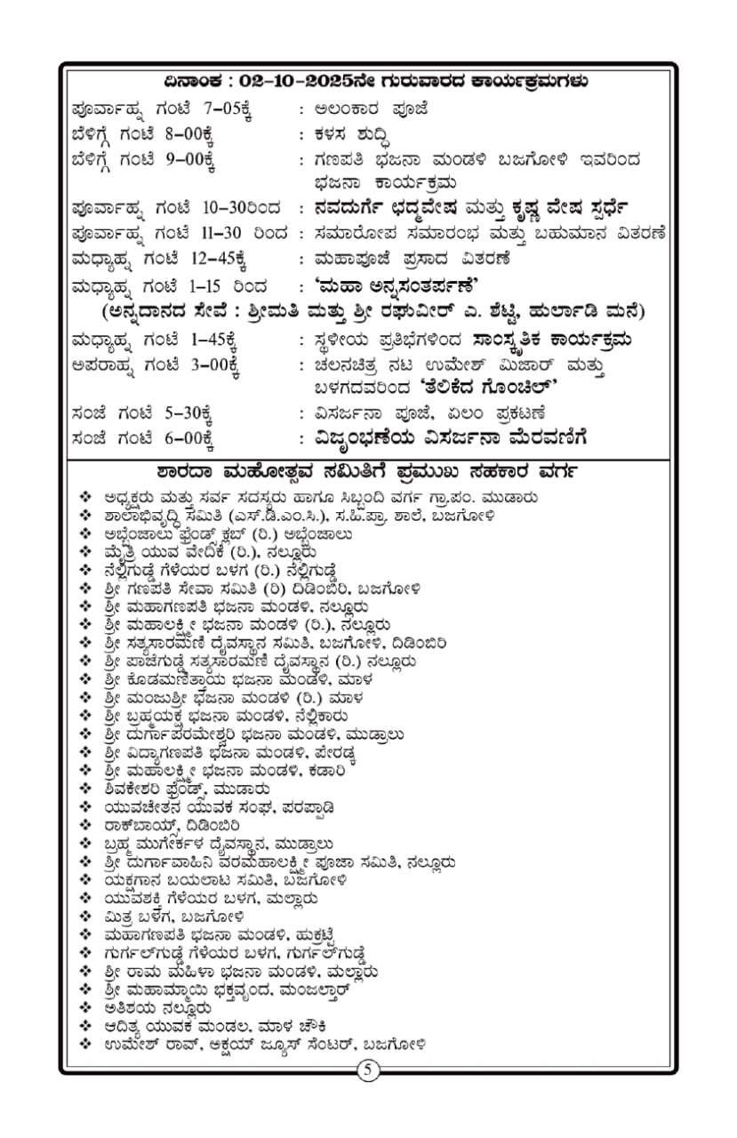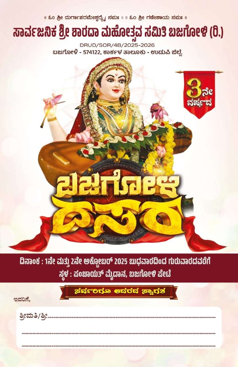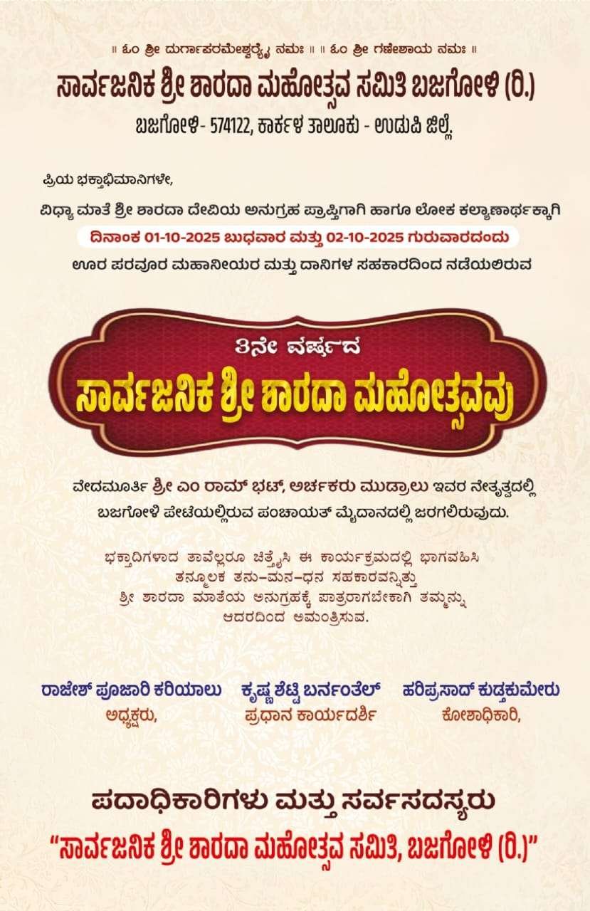 ನಾಡಹಬ್ಬ ದಸರಾ ಪ್ರಯುಕ್ತ ಲೋಕ ಕಲ್ಯಾಣಾರ್ಥವಾಗಿ ಊರ-ಪರವೂರ ದಾನಿಗಳ ಸಹಕಾರದಿಂದ ಈ ಬಾರಿಯೂ 3ನೇ ವರ್ಷದ ಬಜೆಗೋಳಿ ದಸರಾ ಸಾರ್ವಜನಿಕ ಶಾರದಾ ಮಹೋತ್ಸವ ಅದ್ಧೂರಿಯಾಗಿ ನಡೆಯಲಿದೆ.