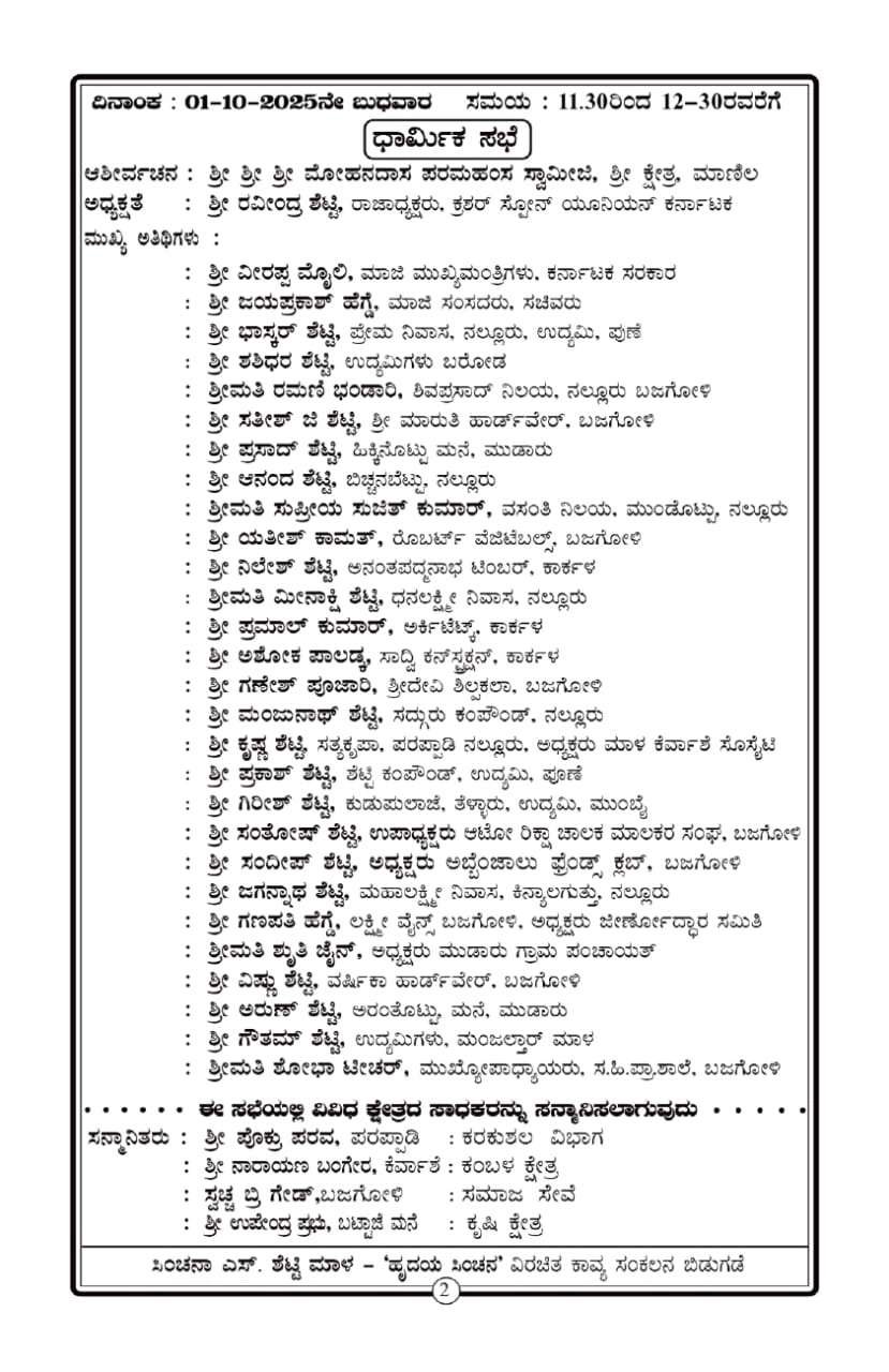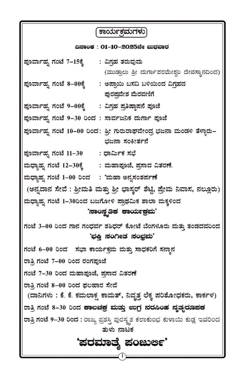 ಬಜೆಗೋಳಿ ಪಂಚಾಯತ್ ಮೈದಾನದಲ್ಲಿ, ರಾಜೇಶ್ ಪೂಜಾರಿ ಕರಿಯಾಲು ಇವರ ಅಧ್ಯಕ್ಷತೆಯಲ್ಲಿ ವೇದಮೂರ್ತಿ ಎಂ. ರಾಮ್ ಭಟ್ ನೇತೃತ್ವದಲ್ಲಿ ನಡೆಯಲಿರುವ ಈ ಕಾರ್ಯಕ್ರಮವು ಅ.1 ರಿಂದ 2 ರವರೆಗೆ ನಡೆಯಲಿದೆ.