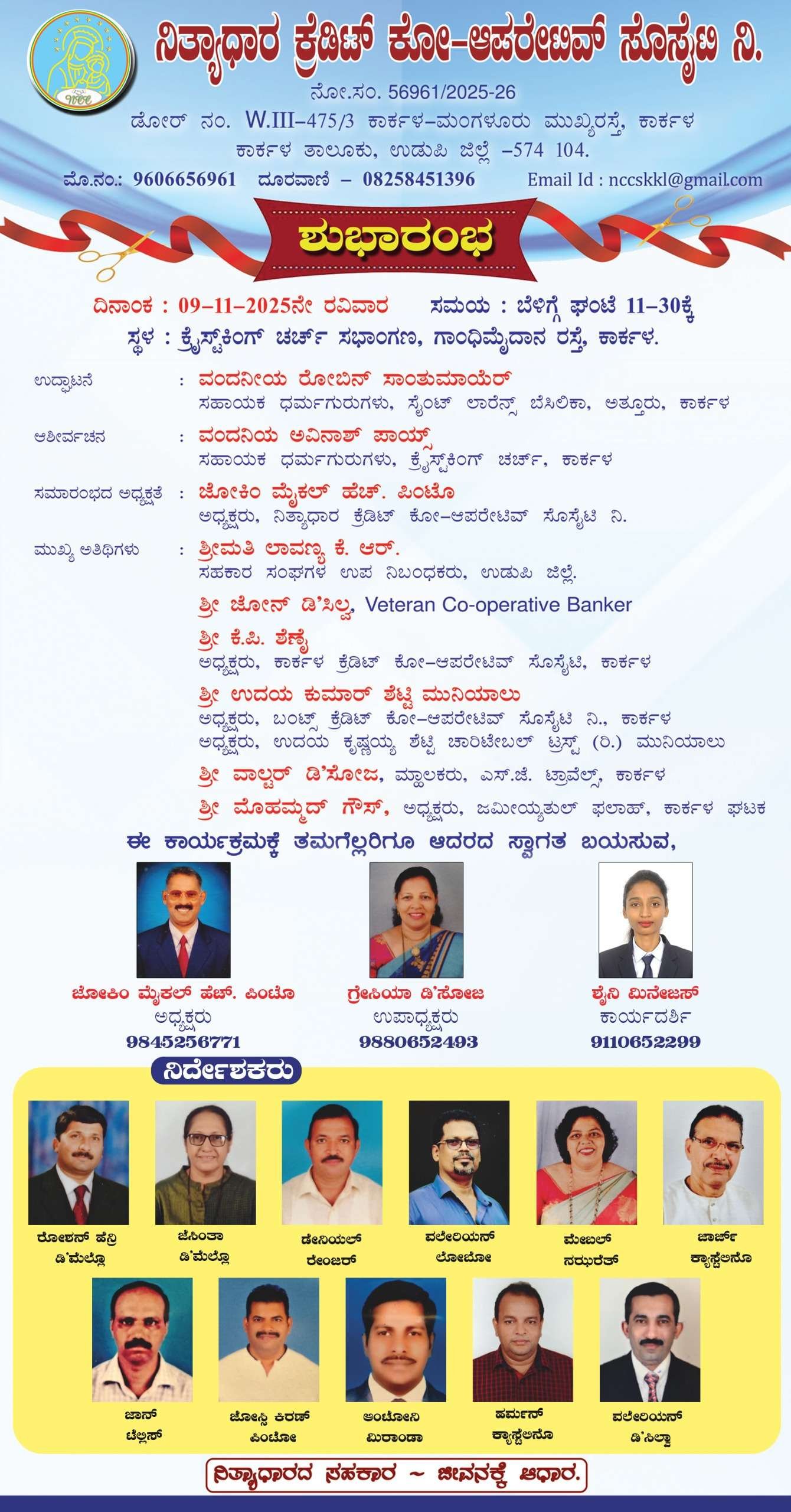 ಕಾರ್ಕಳದಲ್ಲಿ ನ. 9 ರಂದು ನೂತನವಾಗಿ ನಿತ್ಯಾಧಾರ ಕ್ರೆಡಿಟ್ ಕೋ-ಆಪರೇಟಿವ್ ಸೊಸೈಟಿ ಶುಭಾರಂಭಗೊಳ್ಳಲಿದೆ.