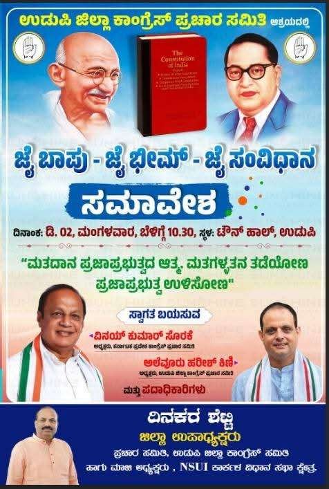 ಕರ್ನಾಟಕ ಪ್ರದೇಶ ಕಾಂಗ್ರೆಸ್ ಪ್ರಚಾರ ಸಮಿತಿಯ ಕಾರ್ಯಕ್ರಮದನ್ವಯ, ಉಡುಪಿ ಜಿಲ್ಲಾ ಕಾಂಗ್ರೆಸ್ ಪ್ರಚಾರ ಸಮಿತಿಯ ಆಶ್ರಯದಲ್ಲಿ, ‘ಜೈ ಬಾಪೂ-ಜೈ ಭೀಮ್-ಜೈ ಸಂವಿಧಾನ _ ಕಾರ್ಯಕ್ರಮವು, ದಿನಾಂಕ – 02/12/2025 ಮಂಗಳವಾರದಂದು, ಬೆಳಿಗ್ಗೆ ಗಂಟೆ – 10.30 ಕ್ಕೆ, ಉಡುಪಿ – ಪುರಭವನದಲ್ಲಿ ಸಭಾಂಗಣ ದಲ್ಲಿ ನಡೆಯಲಿದೆ.