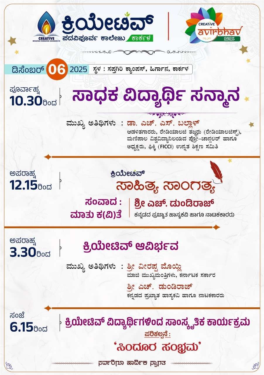 ಕರ್ನಾಟಕದ ಶೈಕ್ಷಣಿಕ ಹಾಗೂ ಸಾಂಸ್ಕೃತಿಕ ಭೂಮಿಕೆಯನ್ನು ಶ್ರೀಮಂತಗೊಳಿಸುತ್ತಿರುವ ಕ್ರಿಯೇಟಿವ್ ಶಿಕ್ಷಣ ಸಂಸ್ಥೆಗಳ ವಾರ್ಷಿಕ ಮಹೋತ್ಸವ “ಕ್ರಿಯೇಟಿವ್ ಆವಿರ್ಭವ–2025” ಡಿ. 4, 5 ಮತ್ತು 6 ರಂದು ವೈಭವದೊಂದಿಗೆ ನಡೆಯಲಿದೆ.
