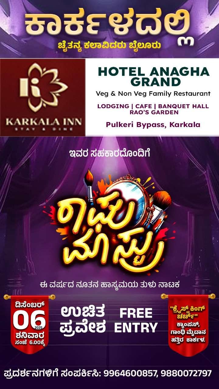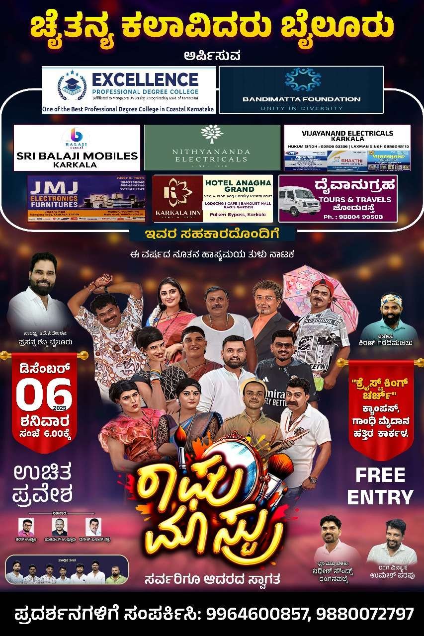 ಚೈತನ್ಯ ಕಲಾವಿದರು ಬೈಲೂರು ಇವರ ತಂಡದಿಂದ ಈ ವರ್ಷದ ನೂತನ ಹಾಸ್ಯಮಯ ನಾಟಕ ರಾಘು ಮೇಸ್ಟ್ರು ಉಚಿತ ಪ್ರದರ್ಶನವು ಡಿ.6ರಂದು ಸಂಜೆ 6 ಗಂಟೆಗೆ ಕಾರ್ಕಳದ ಗಾಂಧಿ ಮೈದಾನ ಬಳಿಯ ಕ್ರೈಸ್ಟ್ ಕಿಂಗ್ ಚರ್ಚ್ ಕ್ಯಾಂಪಸ್ ನಲ್ಲಿ ನಡೆಯಲಿದೆ.