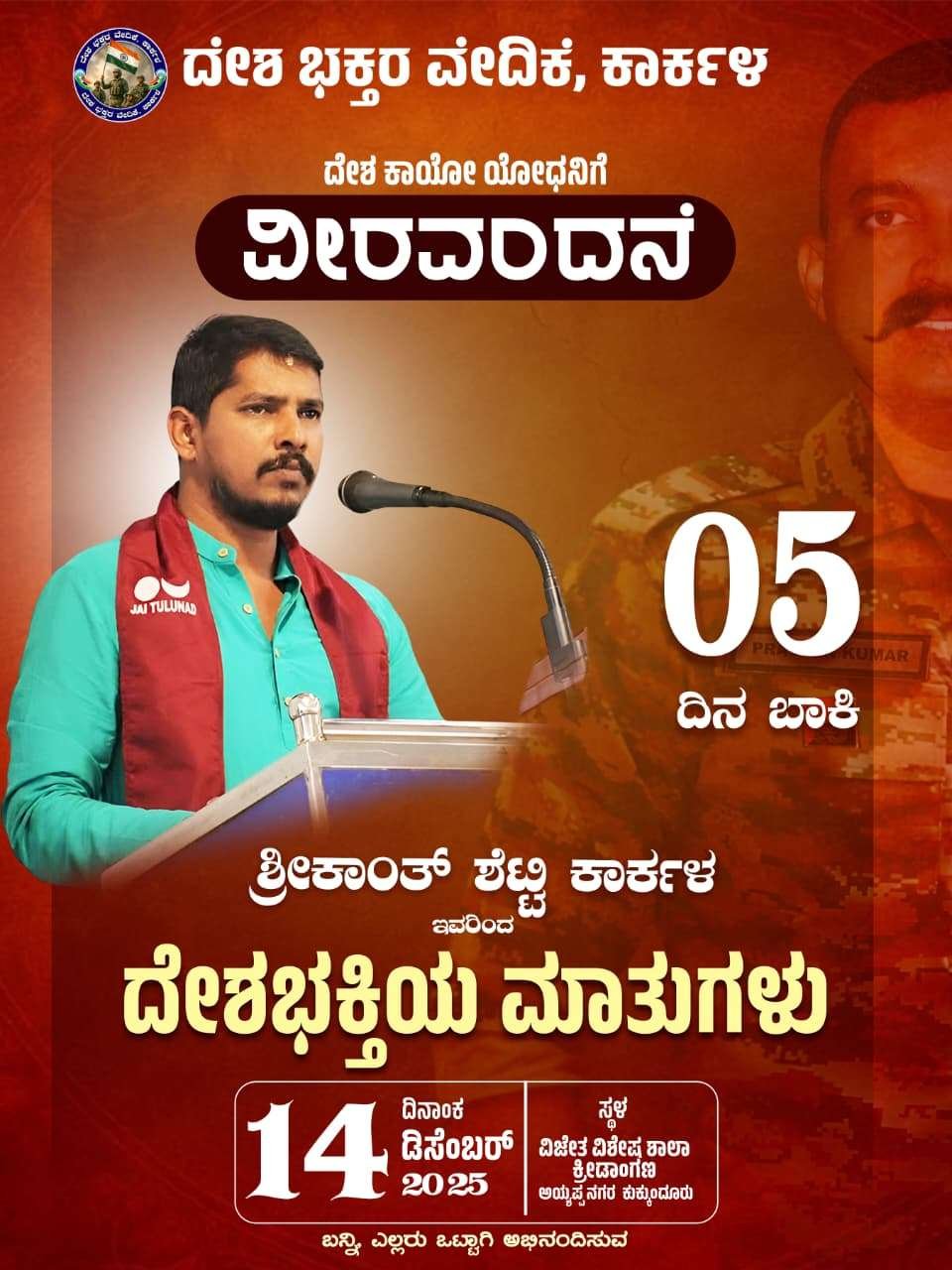 ಸೈನ್ಯದಿಂದ ನಿವೃತ್ತಿ ಹೊಂದಿ ಹುಟ್ಟೂರಿಗೆ ಆಗಮಿಸುತ್ತಿರುವ ಪ್ರವೀಣ್ ಕುಮಾರ್ ಶೆಟ್ಟಿ ಅವರಿಗೆ ನಾಳೆ ಕುಕ್ಕುಂದೂರು ವಿಜೇತ ಶಾಲಾ ಮೈದಾನದಲ್ಲಿ ವಂದನಾ ಕಾರ್ಯಕ್ರಮ ನಡೆಯಲಿದ್ದು, ಕಾರ್ಯಕ್ರಮದಲ್ಲಿ ಕಾರ್ಕಳದ ಪ್ರಖರ ಯುವ ವಾಗ್ಮಿ ಶ್ರೀಕಾಂತ್ ಶೆಟ್ಟಿಯವರು ದೇಶಭಕ್ತಿ ಮಾತುಗಳನ್ನಾಡಲಿದ್ದಾರೆ.