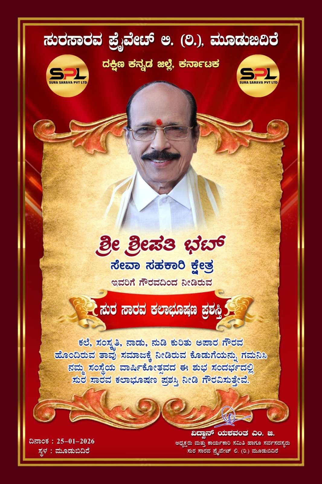 ಉದ್ಯಮಿ,ಸಮಾಜಸೇವಕ,ಕೊಡುಗೈ ದಾನಿ ಕೆ.ಶ್ರೀಪತಿ ಭಟ್ ರವರಿಗೆ ಸುರಸರವ ಪ್ರಶಸ್ತಿ ಪ್ರಧಾನ ನಡೆಯಲಿದೆ.