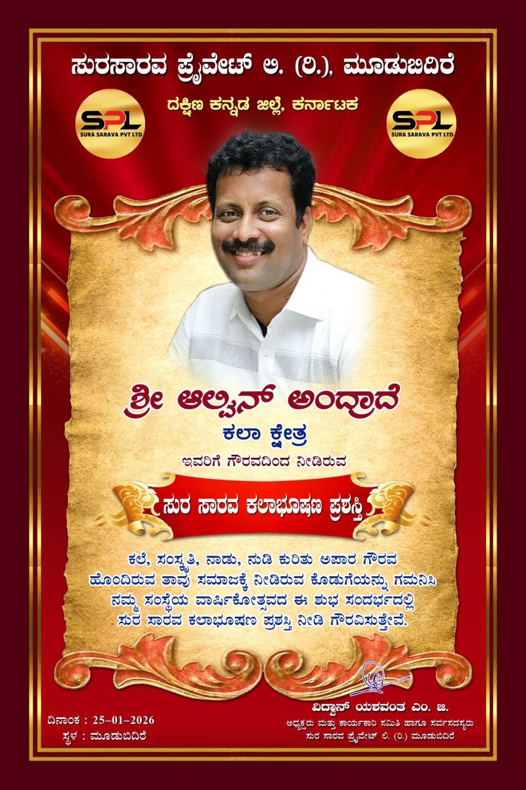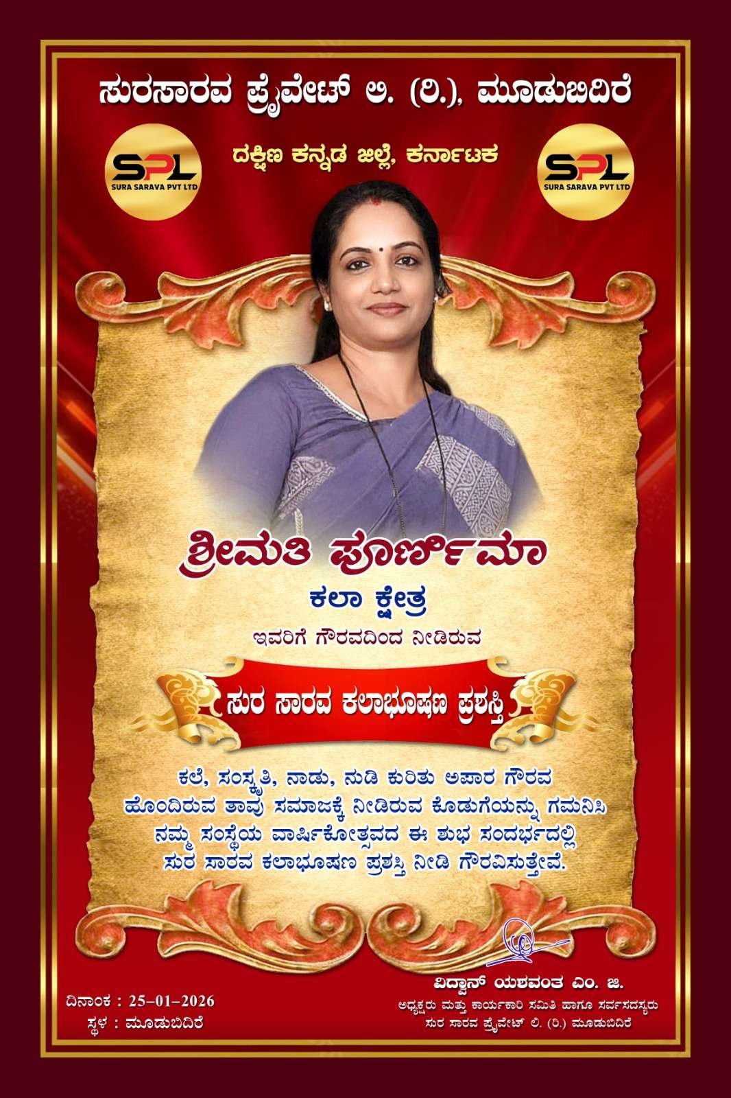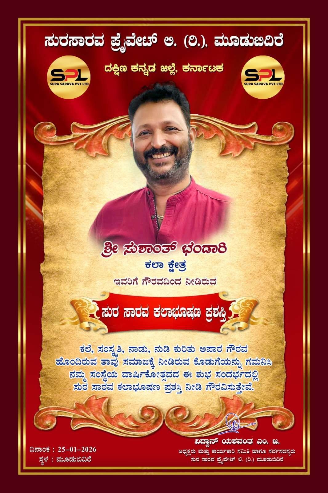 ಶ್ರೀಮತಿ ಪೂರ್ಣಿಮಾ ಉಡುಪಿ,ಶಶಿಧರ್ ಭಟ್,ಆಲ್ವಿನ್ ಅಂದ್ರಾದೆ,ಸುಶಾಂತ್ ಭಂಡಾರಿ ಇವರಿಗೆ ಸುರಸಾರವ ಕಲಾ ಭೂಷಣ ಪ್ರಶಸ್ತಿ ಪ್ರಧಾನ ನಡೆಯಲಿದೆ.