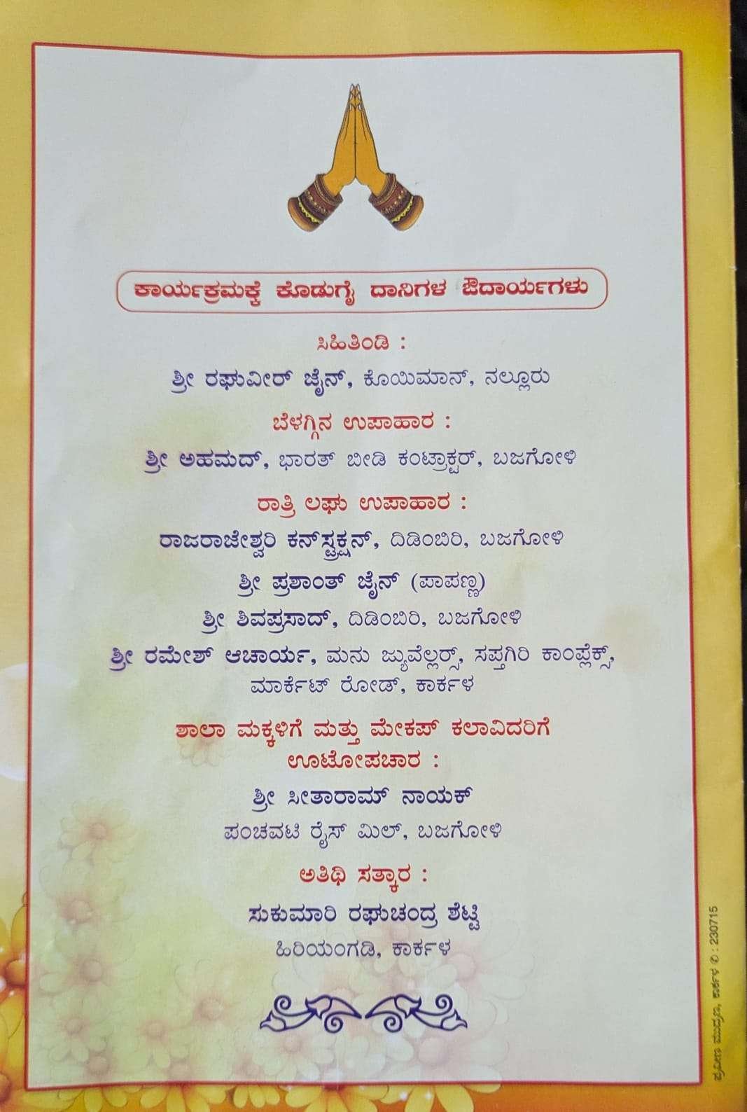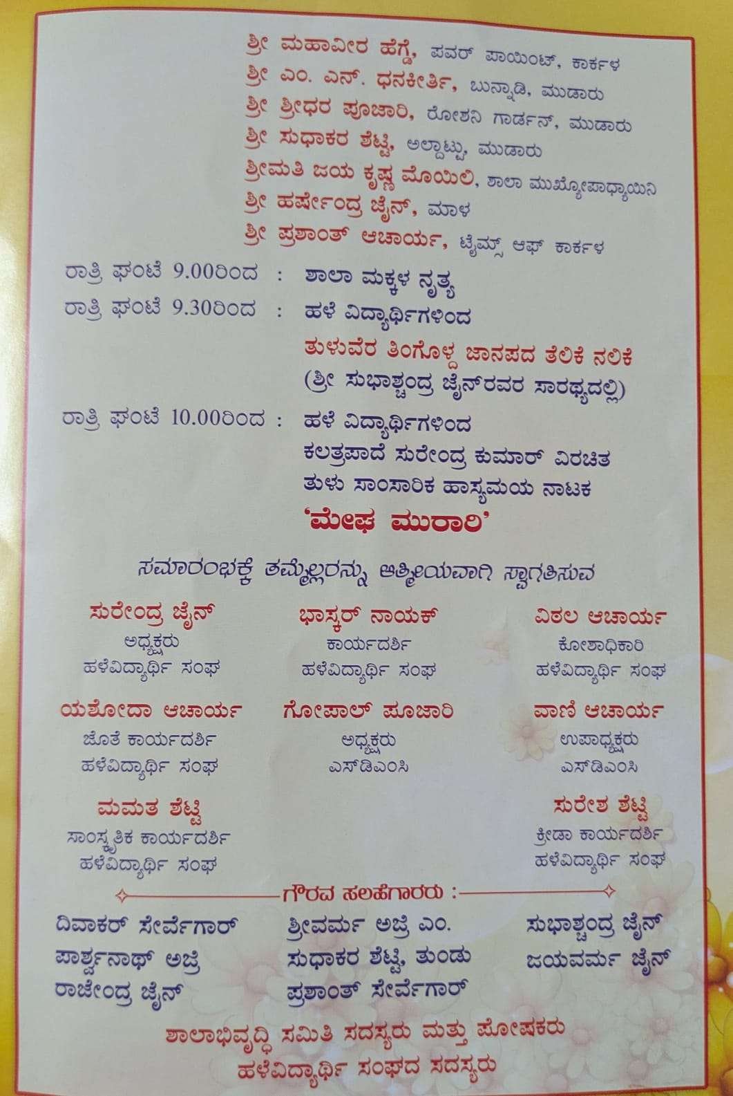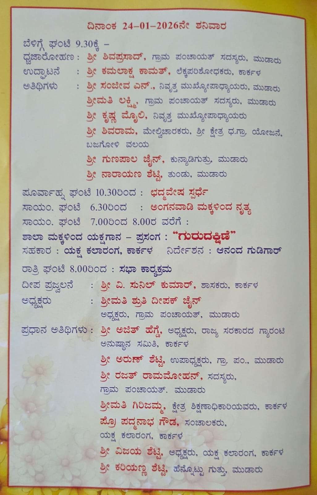 ರಾತ್ರಿ 8 ಗಂಟೆಗೆ ಸರಿಯಾಗಿ ಸಭಾ ಕಾರ್ಯಕ್ರಮ ನಡೆಯಲಿದ್ದು, ಕಾರ್ಯಕ್ರಮದ ದೀಪ ಪ್ರಜ್ವಲನೆಯನ್ನು ಶಾಸಕ ವಿ. ಸುನಿಲ್ ಕುಮಾರ್ ರವರು ನೆರವೇರಿಸಲಿದ್ದಾರೆ. ಕಾರ್ಯಕ್ರಮದ ಅಧ್ಯಕ್ಷತೆಯನ್ನು ಮುಡಾರು ಗ್ರಾಮ ಪಂಚಾಯತ್ ಅಧ್ಯಕ್ಷೆ ಶ್ರುತಿ ದೀಪಕ್ ಜೈನ್ ನಿರ್ವಹಿಸಲಿದ್ದಾರೆ. ಸಭೆಯ ಪ್ರಧಾನ ಅತಿಥಿಗಳಾಗಿ ಕಾರ್ಕಳ ತಾಲೂಕು ಗ್ಯಾರಂಟಿ ಅನುಷ್ಠಾನ ಸಮಿತಿ ಅಧ್ಯಕ್ಷ ಅಜಿತ್ ಹೆಗ್ಡೆ ಮಾಳ, ಮುಡಾರು ಗ್ರಾಮ ಪಂಚಾಯತ್ ಉಪಾಧ್ಯಕ್ಷ ಅರುಣ್ ಶೆಟ್ಟಿ, ಮುಡಾರು ಗ್ರಾಮ ಪಂಚಾಯತ್ ಸದಸ್ಯ ರಜತ್ ರಾಮಮೋಹನ್, ಕಾರ್ಕಳ ಕ್ಷೇತ್ರ ಶಿಕ್ಷಣಾಧಿಕಾರಿ ಗಿರಿಜಮ್ಮ, ಕಾರ್ಕಳ ಯಕ್ಷ ಕಲಾ ರಂಗದ ಸಂಚಾಲಕರಾದ ಪ್ರೊ| ಪದ್ಮನಾಭ ಗೌಡ, ಟೈಮ್ಸ್ ಆಫ್ ಕಾರ್ಕಳದ ಮುಖ್ಯಸ್ಥ ಪ್ರಶಾಂತ್ ಆಚಾರ್ಯ, ಕಾರ್ಕಳ ಯಕ್ಷ ಕಲಾ ರಂಗದ ಅಧ್ಯಕ್ಷ ವಿಜಯ ಶೆಟ್ಟಿ, ಕರಿಯಣ್ಣ ಶೆಟ್ಟಿ ಹೆನ್ನೊಟ್ಟು, ಮಹಾವೀರ ಹೆಗ್ಡೆ, ಪವರ್ ಪಾಯಿಂಟ್, ಕಾರ್ಕಳ, ಎಂ. ಎನ್. ಧನಕೀರ್ತಿ ಬುನ್ನಾಡಿ, ಶ್ರೀಧರ ಪೂಜಾರಿ ರೋಶನಿ ಗಾರ್ಡನ್, ಮುಡಾರು, ಸುಧಾಕರ ಶೆಟ್ಟಿ ಅಲ್ಪಾಟ್ಟು, ಶಾಲಾ ಮುಖ್ಯೋಪಾಧ್ಯಾಯಿನಿ ಜಯ ಕೃಷ್ಣ ಮೊಯಿಲಿ, ಹರ್ಷೇಂದ್ರ ಜೈನ್ ಮಾಳ ಮೊದಲಾದವರು ಉಪಸ್ಥಿತರಿರಲಿದ್ದಾರೆ.