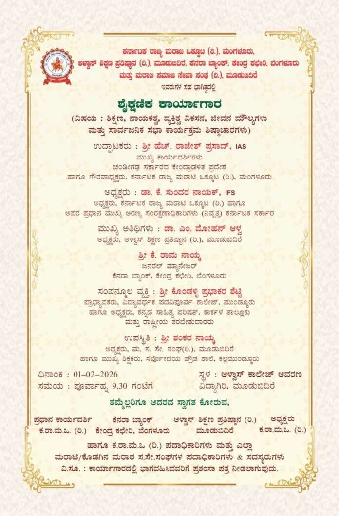 ಶಿಕ್ಷಣ, ನಾಯಕತ್ವ, ವ್ಯಕ್ತಿತ್ವ ವಿಕಸನ, ಜೀವನ ಮೌಲ್ಯಗಳು, ಸಾರ್ವಜನಿಕ ಸಭಾ ಕಾರ್ಯಕ್ರಮ ಶಿಷ್ಟಾಚಾರಗಳ ವಿಷಯದ ಬಗ್ಗೆ ಶೈಕ್ಷಣಿಕ ಕಾರ್ಯಾಗಾರವು ಫೆ. ೧ ರಂದು ಮೂಡಬಿದ್ರೆಯ ಆಳ್ವಾಸ್ ಕಾಲೇಜು ಆವರಣದಲ್ಲಿ ನಡೆಯಲಿದೆ.