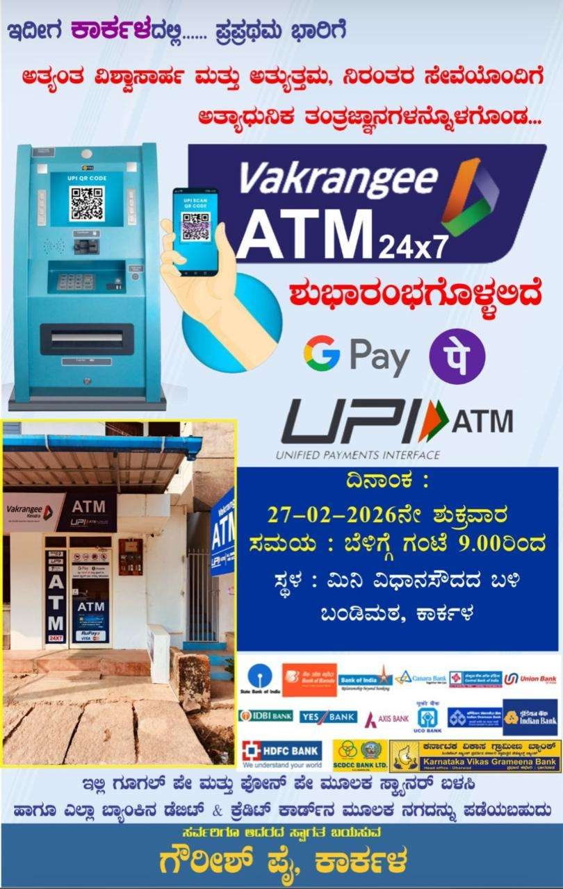 ನಾಳೆ (ಫೆ.27) ಕಾರ್ಕಳದ ಬಂಡೀಮಠ ಮಿನಿ ವಿಧಾನಸೌಧ ಬಳಿ ನೂತನವಾಗಿ Vakrangee ATM ಶುಭಾರಂಭಗೊಳ್ಳಲಿದೆ.