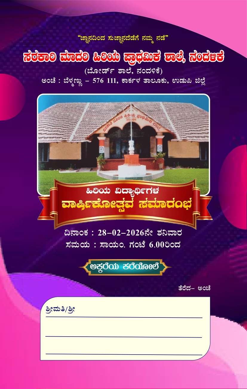 ಕಾರ್ಕಳ:ನೂರು ವರ್ಷ ಪೂರೈಸಿ ಮುನ್ನಡೆಯುತ್ತಿರುವ ಬೋರ್ಡ್ ಶಾಲೆ ನಂದಳಿಕೆಯಲ್ಲಿ ಫೆ.28 ಶನಿವಾರದಂದು ಹಿರಿಯ ವಿದ್ಯಾರ್ಥಿಗಳ ವಾರ್ಷಿಕೋತ್ಸವ ನಡೆಯಲಿದೆ.