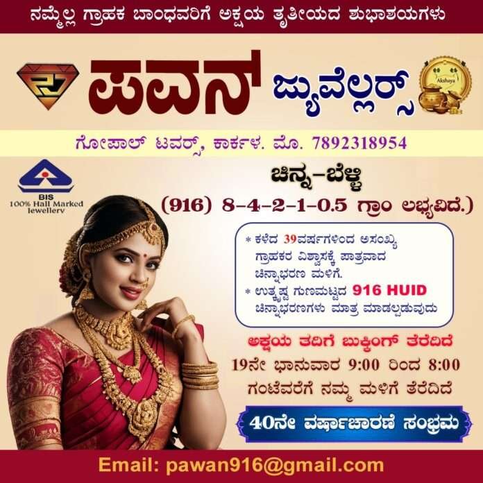 ಗೋಪಾಲ್ ಟವರ್ಸ್ನಲ್ಲಿ ಕಳೆದ 39 ವರ್ಷಗಳಿಂದ ಗ್ರಾಹಕರ ವಿಶ್ವಾಸಕ್ಕೆ ಪಾತ್ರವಾಗಿರುವ ಚಿನ್ನ ಮತ್ತು ಬೆಳ್ಳಿ ಆಭರಣಗಳ ಮಳಿಗೆ ‘ಪವನ್ ಜುವೆಲ್ಲರ್ಸ್ನಲ್ಲಿ ಅಕ್ಷಯ ತೃತೀಯಾ ಅಂಗವಾಗಿ ಬುಕ್ಕಿಂಗ್ ಪ್ರಕ್ರಿಯೆ ಆರಂಭಗೊಂಡಿದೆ. ಎ.19ರಂದು ಬೆಳಗ್ಗೆ 9 ಗಂಟೆಯಿಂದ ಸಂಜೆ 6 ಗಂಟೆಯವರೆಗೆ ಬುಕ್ಕಿಂಗ್ಗಾಗಿ ಮಳಿಗೆ ತೆರೆದಿರುತ್ತದೆ.