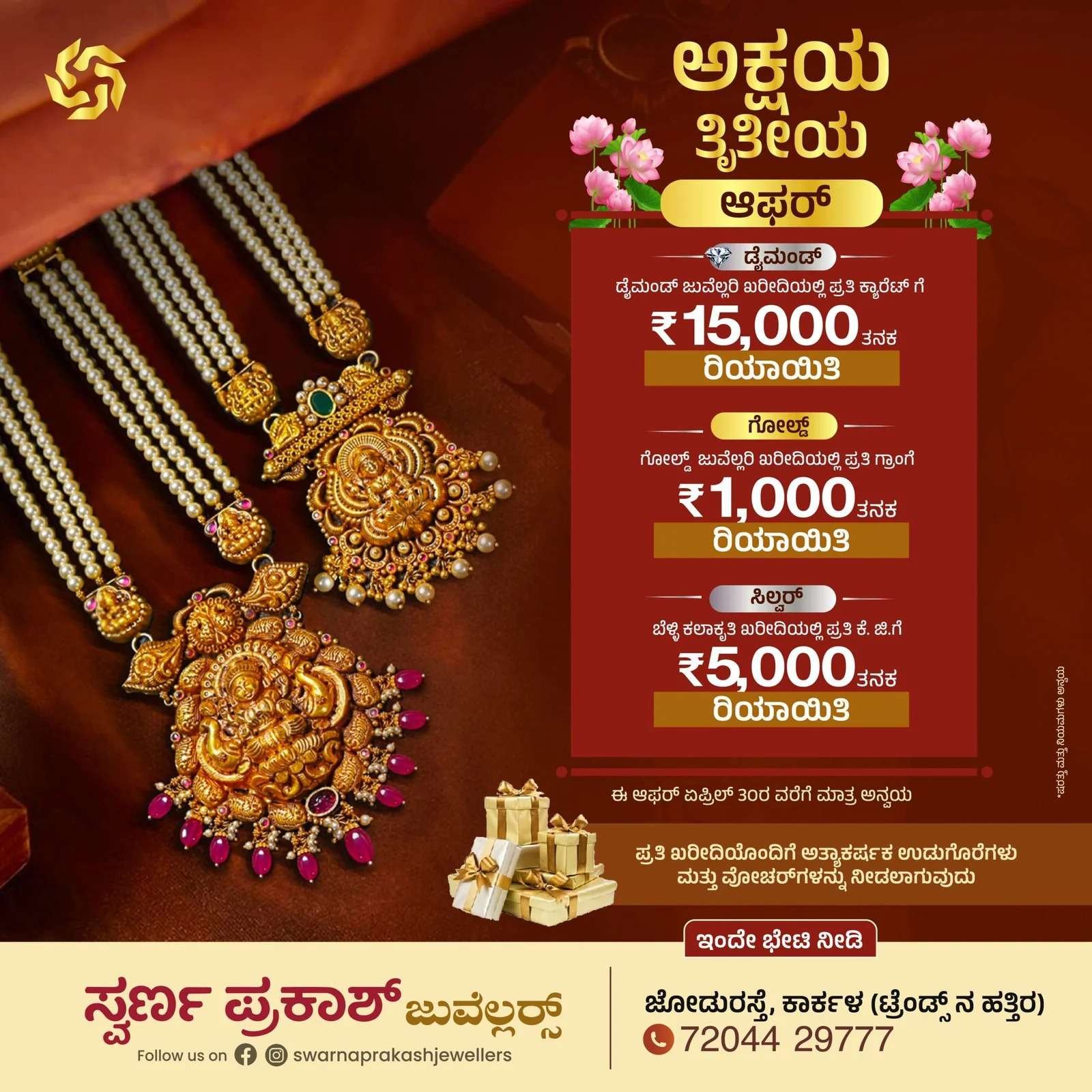 ಅಕ್ಷಯ ತೃತೀಯಾ ಪ್ರಯುಕ್ತ ಗ್ರಾಹಕರಿಗೆ ವಿಶೇಷ ಆಫರ್ ಅನ್ನು ಸ್ವರ್ಣ ಪ್ರಕಾಶ್ ಜ್ಯುವೆಲ್ಲರ್ಸ್ ಸಂಸ್ಥೆ ನೀಡಿದೆ.