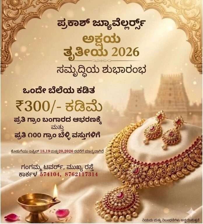 ಅಕ್ಷಯ ತೃತೀಯಾ ಪ್ರಯುಕ್ತ ಗ್ರಾಹಕರಿಗೆ ವಿಶೇಷ ಆಫರ್ ಅನ್ನು ಪ್ರಕಾಶ್ ಜ್ಯುವೆಲ್ಲರ್ಸ್ ಸಂಸ್ಥೆ ನೀಡಿದೆ.